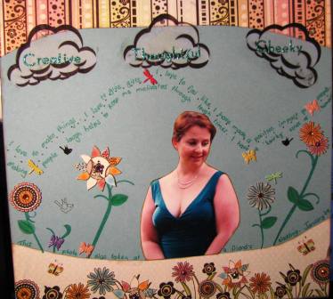 Creative, Thoughtful, Cheeky - that's me in a Nutshell. For this Challenge, I used Daisy Bucket Designs PP, Cordinations CS, Smiggle Gel Pen, Stampin' Up Stamp, Watercolour, Papercraft Glitter Brads, Kaiser Craft Rubons & Rhinestones, MM Mini Shimmer Alphas, Velum (I printed the Clouds on this). The 'less favourite' scrapping technique is 'stamping' (the leaves).