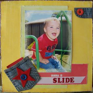 BG pp, DCWV scraps, I have recycled the fly bit and the pocket from the pair of jeans that Ethan is wearing in the photo.