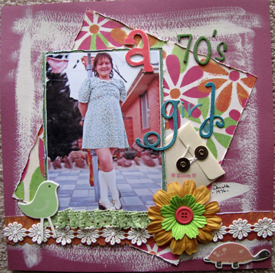 Think I got all the elements. I tried to keep with our flower power theme and scrapped a photo of myself back in 1976!!!! Checkout the clothes line in the background, it had undies hanging up LOL.