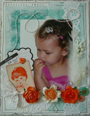My take on the colour challenge- 2 scrap pieces of aqua c/stock on the background, sponged and painted over with white to bring it together, some feathers, pearls and prima yummies, lace and buttons. tfl Loved this colour combo.