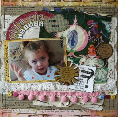 My take on the sketch challenge. Used BG Lemonade range as b/ground. My photo is the smaller rectangle, the paper doily is the larger rect. piece, the cloud and the other thingy are from FP Kraft Kuts range, machine stitched border and on photo matt and heaps of scribble (I mean journalling). tfl