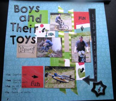 I took the bright colours and the whole idea of playing and fun to create this - of one of the biggest kids I know - my DH. I used Bella! School Dayz PP, American Crafts PP, Bazzil CS, Kaisercolour Paint, Versacolour Inks, Ribbons from stash, Craft Affair Arrow Brads, Hot off the Press Clear Stamps, Bella! Chipz.