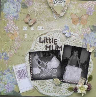 I was inspired by the cute girl and her Pram - my 3 yr old daughter is obsessed with her babies and puts them to sleep all over the house.....so here she is - Websters pages ,....TFL
