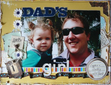 My take on the DT's f/well challenge. I've used some little bits of raks I have rec'd from some of the DTer's over their time that were either little thankyou's for swaps or raks for challenges they set - maybe they will remember - the stripe rubon on the tape, the Daddy hanger, the braille paper, flowers and lace. Criteria -2 diff thickers, 3d Stamped image (the journalling spot is layered with foam tape), substantial journalling (slide out tag under photo) and distressed edges & lace/trim.
