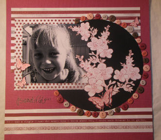 This layout l have used SEI & Little Yellow Bicycle papers, SEI buttons and DEja View rub-ons, the flowers and butterflies are hand cut out. The photo is of my daughter whom loves the camera!